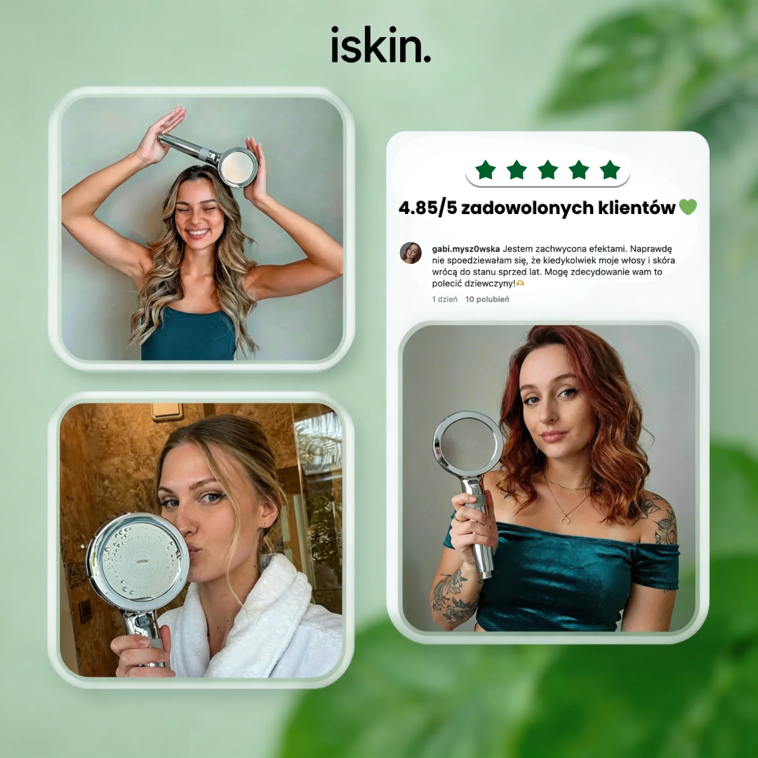 Użytkownicy iskin zauważają średnio bardziej miękką skórę i zdrowsze włosy już po pierwszym prysznicu.